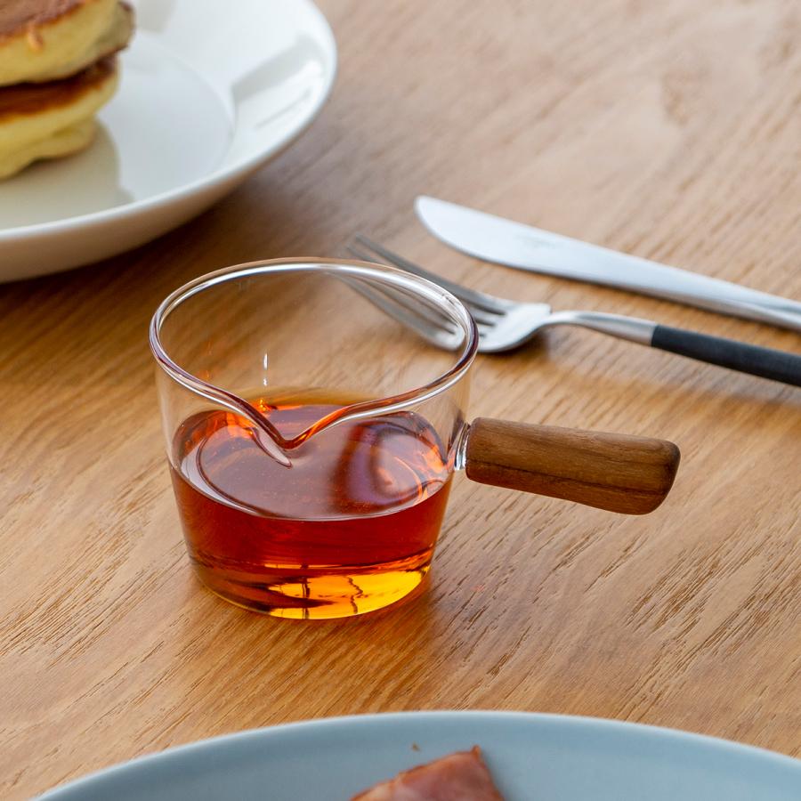 Tasses à Lait Japonaises : Set de 6 mini tasses en verre avec bec verseur et poignée en bois, parfait pour un service sophistiqué.