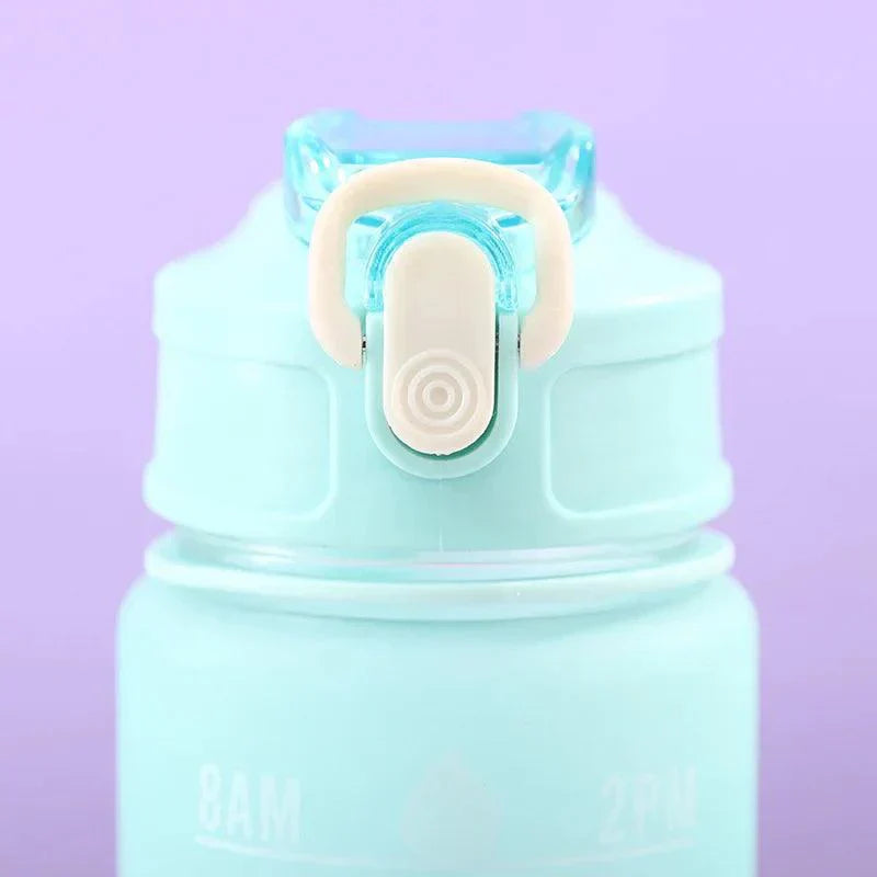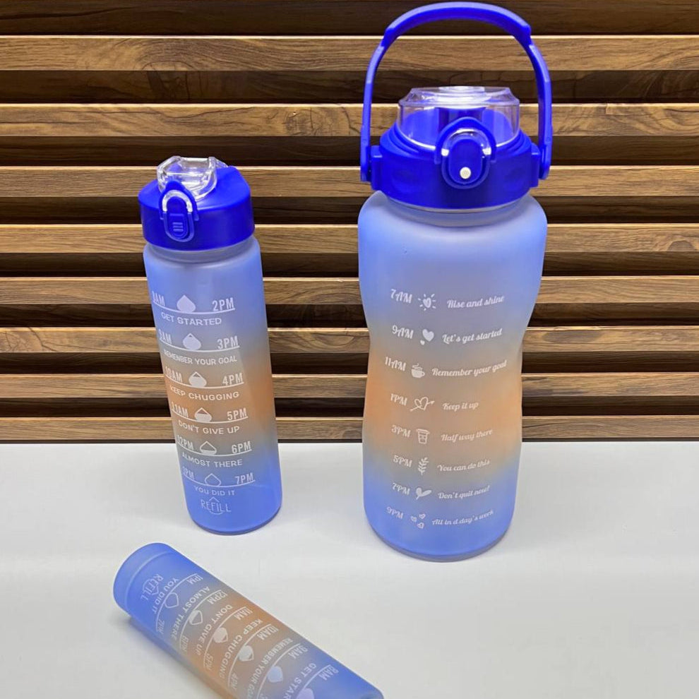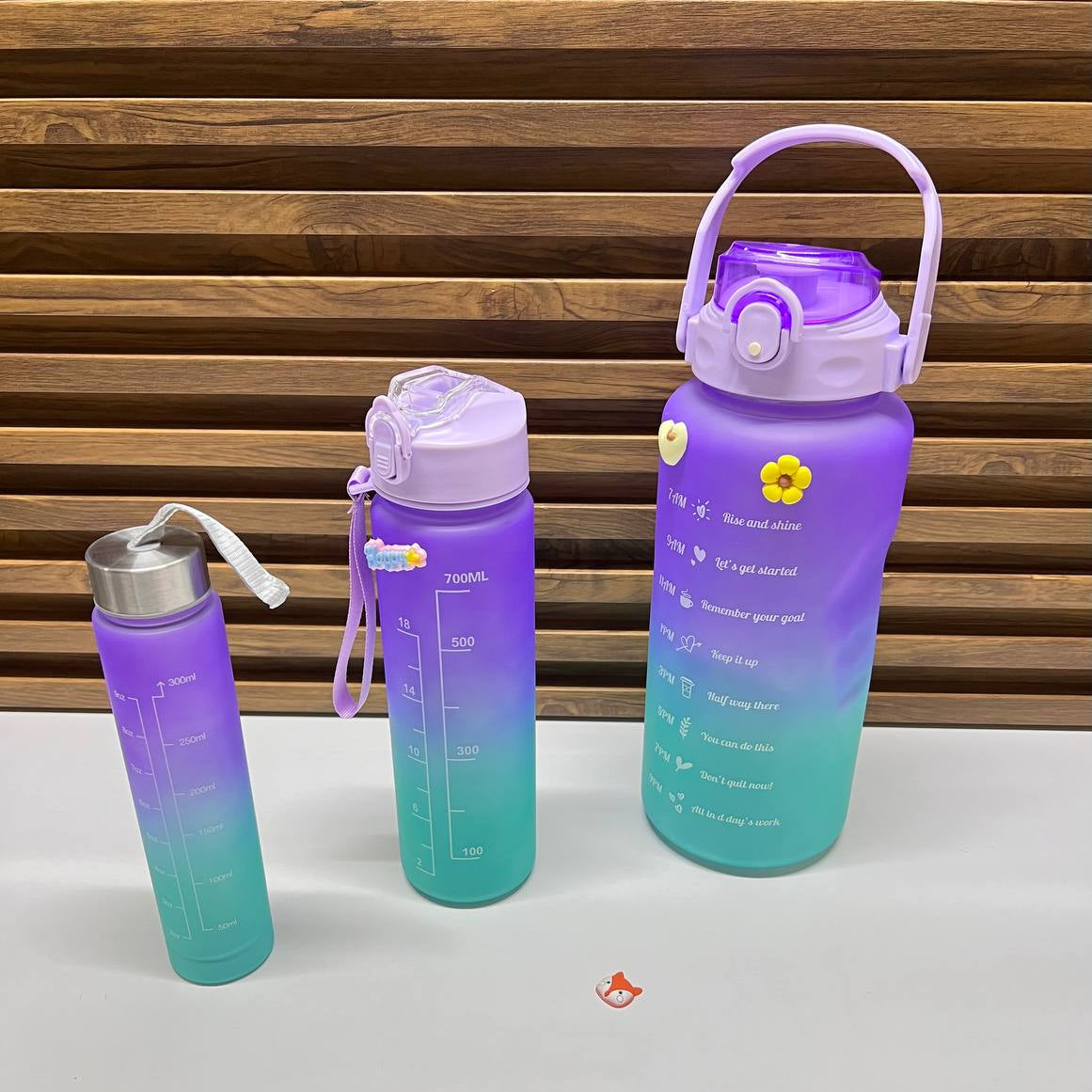 L'image montre trois bouteilles d'eau aux couleurs dégradées, chacune avec un motif ombré allant du violet au bleu sarcelle.