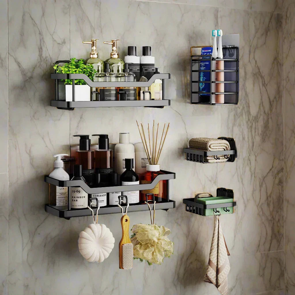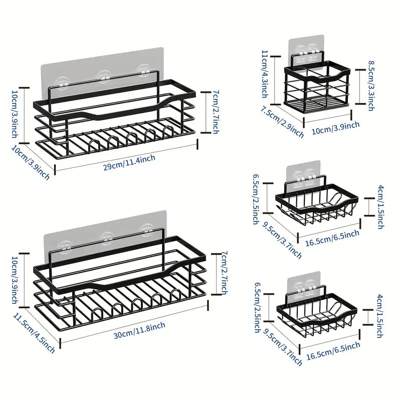 ENSEMBLE ORGANISATEUR DE DOUCHE 5 PIÈCES : L'ensemble d'étagères de douche de salle de bain comprend 2 supports de douche muraux (différentes tailles), 2 porte-savons, 1 porte-brosse à dents et 8 adhésifs.