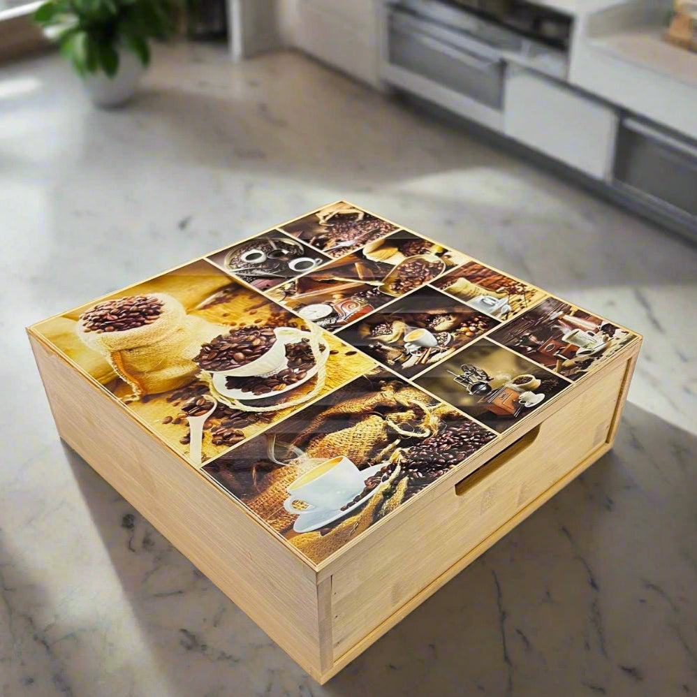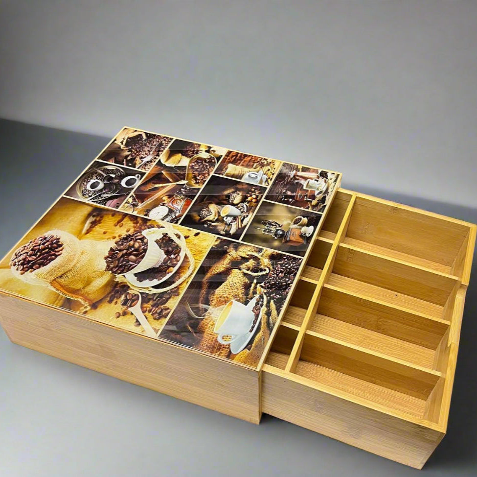 Ajoutez une touche naturelle et élégante à votre cuisine ou coin café avec cet organisateur de sachets de thé en bambou. Conçu pour le rangement optimal de vos sachets de thé, infusions ou dosettes de café, il allie esthétique et fonctionnalité. Idéal pour les plans de travail, tiroirs ou buffets.