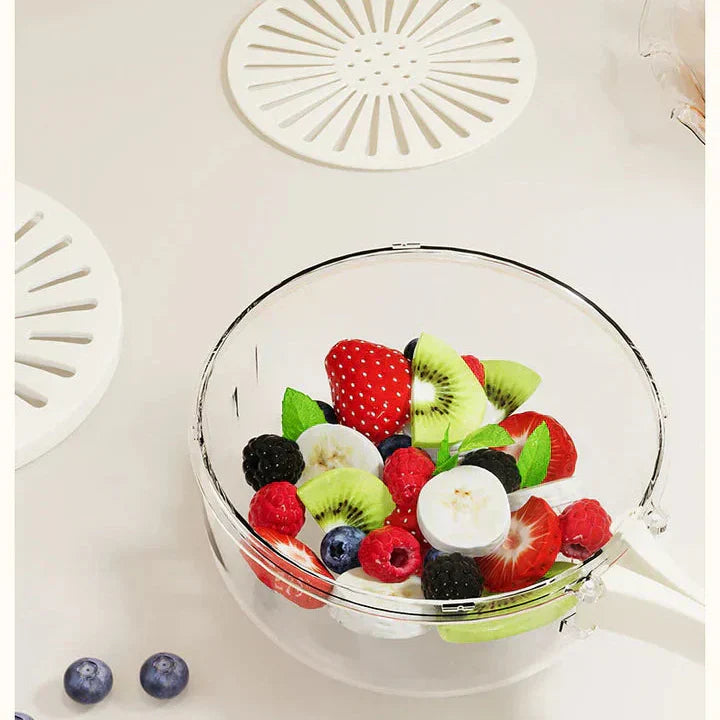 Lavage et égouttage efficaces : la conception en filet creux du couvercle de la passoire de cuisine, équipée d'un bouton pour une ouverture et une fermeture faciles. Notre panier intérieur amovible pour un rinçage sans effort, assure un lavage et un égouttage efficaces des fruits et légumes.